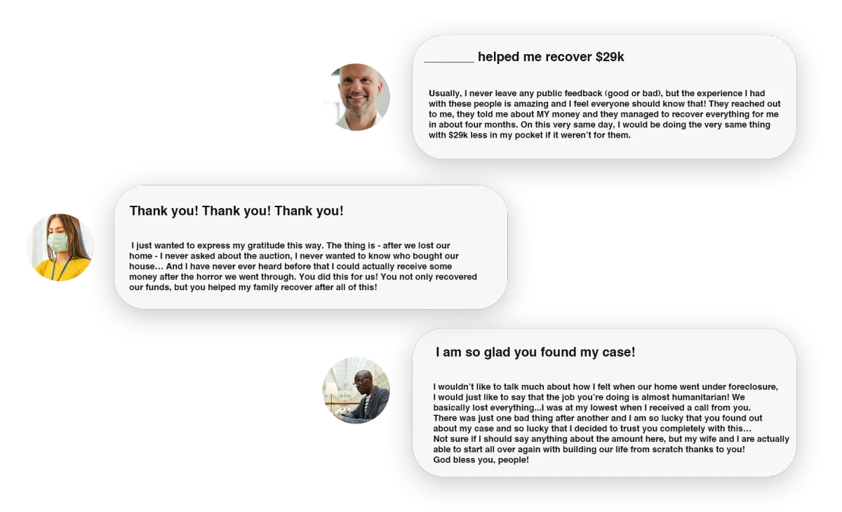 We believe that each and every citizen has the right to know this and that is why we want to join our forces and help you recover your funds after the foreclosure.